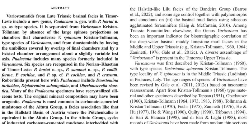 The fossils are documented in a scientific article titled “Upper Triassic (Norian–Rhaetian) Variostomatids (Foraminifera), Timor-Leste: Systematics, Paleoenvironmental, and Biostratigraphic Implications.”